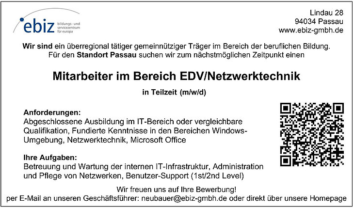 Die ebiz gmbh, mit ihrer Zentrale in Passau, ist ein gemeinnütziger Träger der beruflichen Bildung. Mit 140 Festangestellten und ca. 40 freiberuflichen Mitarbeitern betreuen wir an 3 Standorten mit Qualifizierungs- und Fortbildungsmaßnahmen im Durchschnitt 200 Kursteilnehmer pro Tag. Zudem sind wir in den Landkreisen Passau, FRG und Mühldorf an ca. 15 Schulen mit Betreuungsmaßnahmen und Ganztagsbetreuungen direkt vor Ort vertreten.